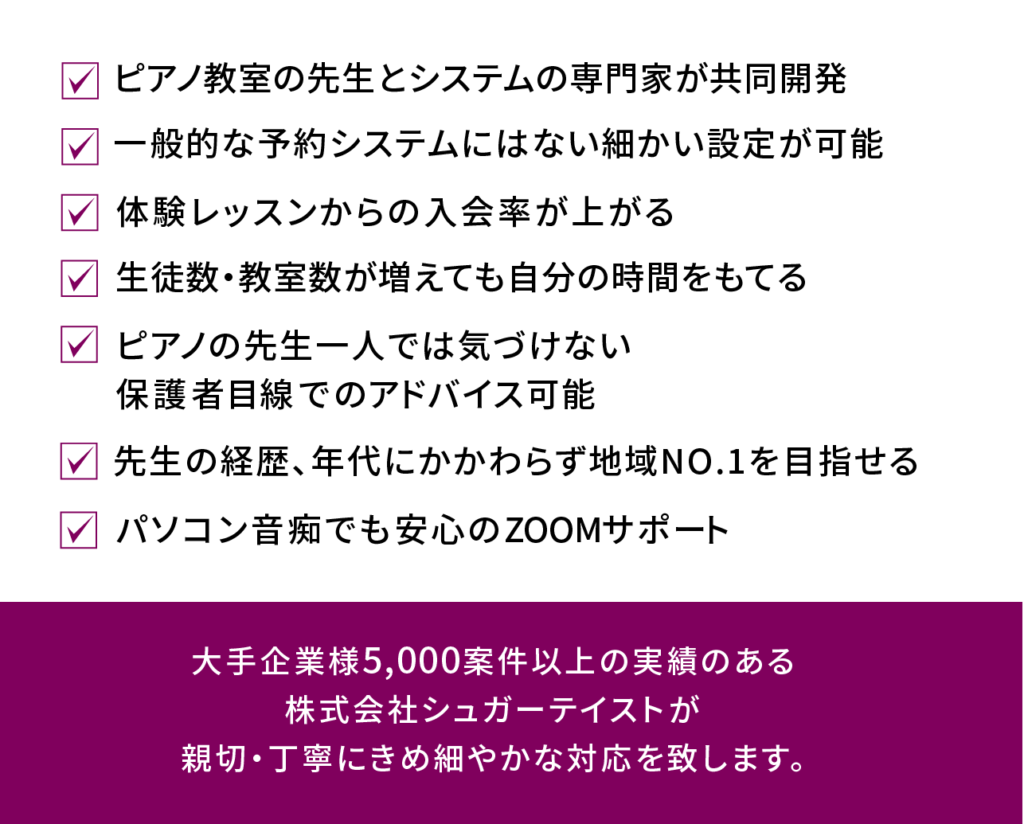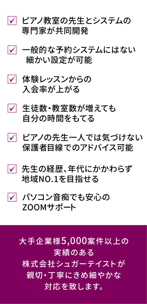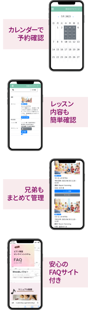 また、ホームページ上でレッスンの予約を行うことができるので、メールでの予約手続き連絡の手間が省けましたし、支払いの確認が自動的に送信されて記録に残るので、教室側は手動での通知作業が省け、生徒様の信用を得られました。特に、補講レッスンでは、